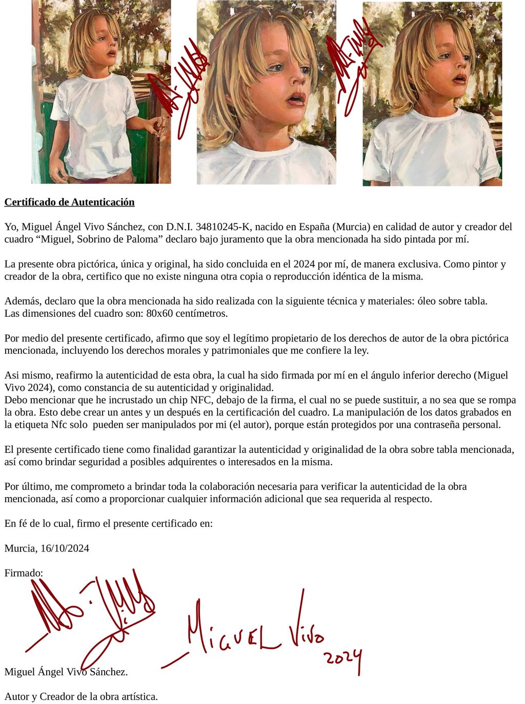 Certificado de Autenticación. Retrato de Miguel, sobrino de Paloma.